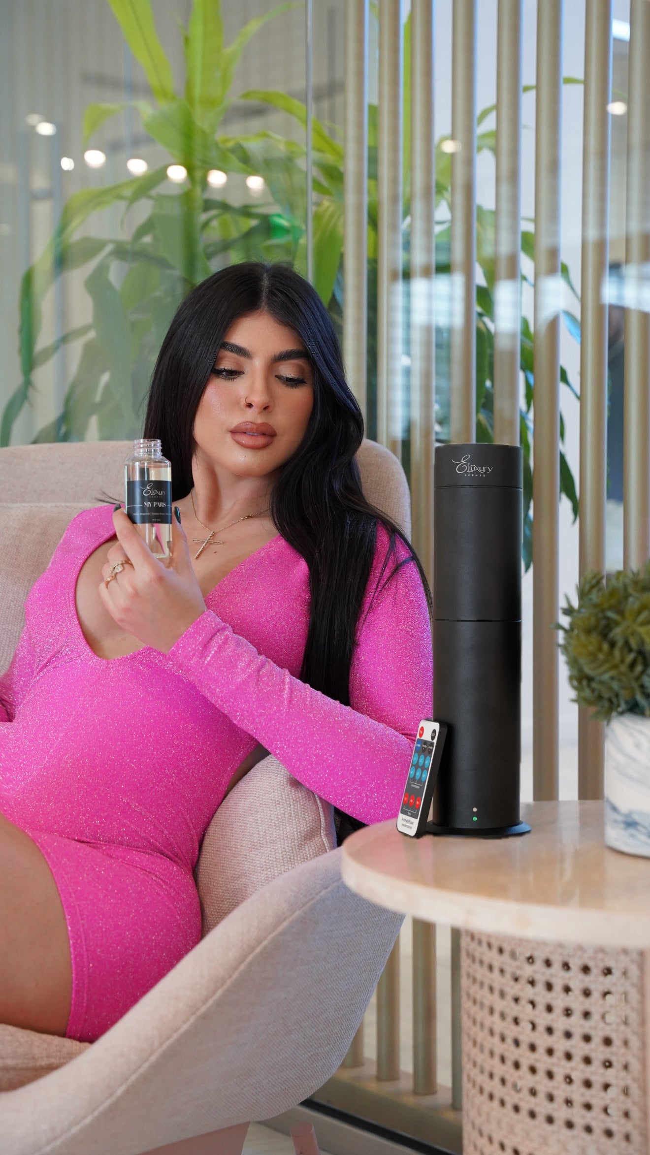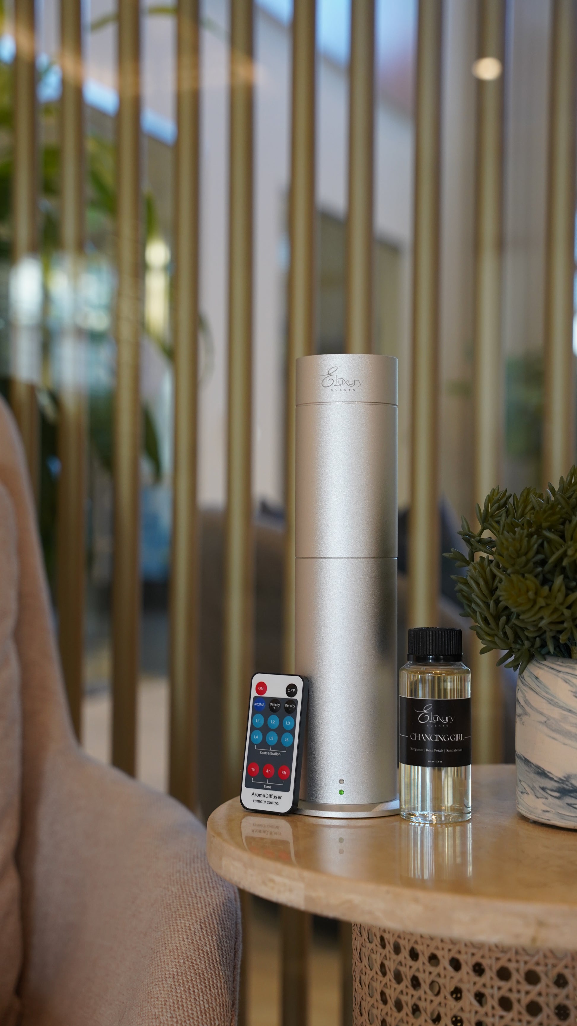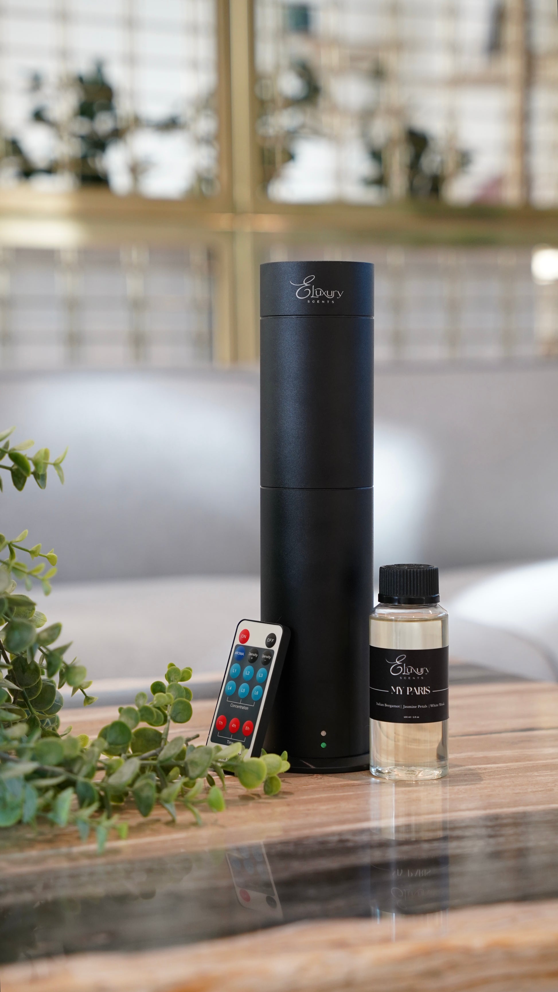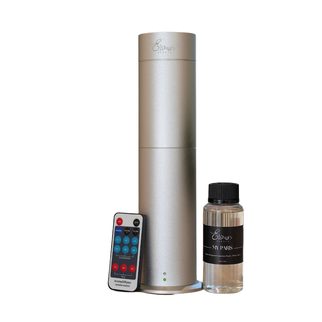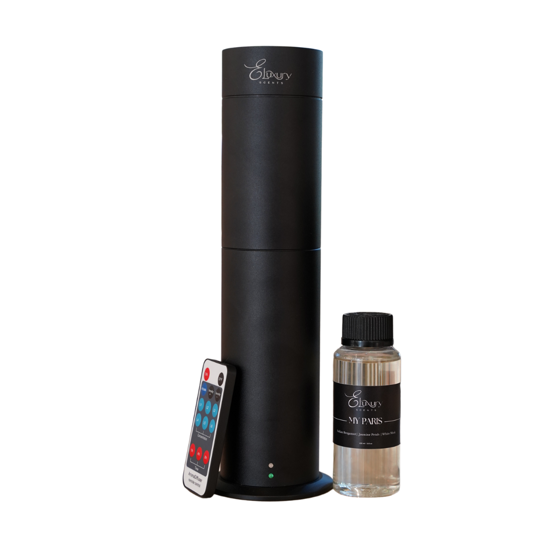 El paquete incluye el difusor de torre Elux y una botella de 100 ml de aceite aromático de su elección.