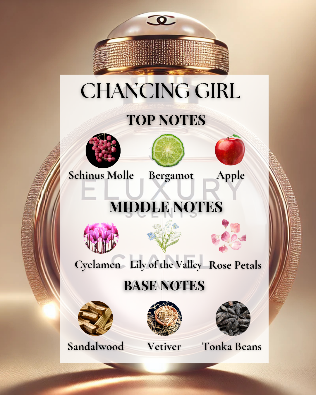 Inspirada en la esencia icónica de Chanel Chance, Chancing Girl nace para inspirar a las mujeres a atreverse a caminar hacia sus sueños. Este aroma no es solo una fragancia, es una invitación a vivir con valentía.