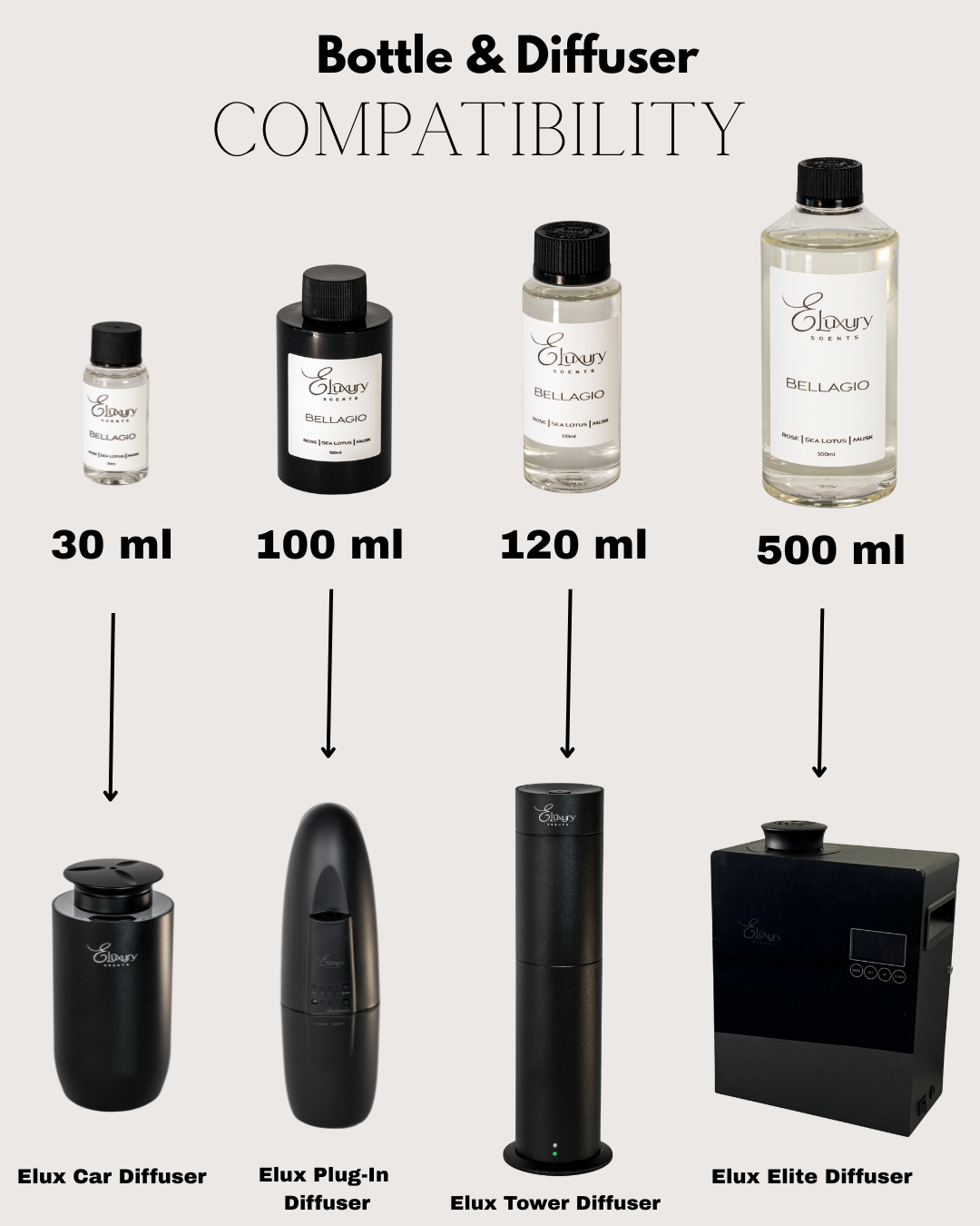 - 30 ml : Ideal size for Elux Car Diffuser and it's also the best option if you're looking to try different options of fragances before deciding on your favorite